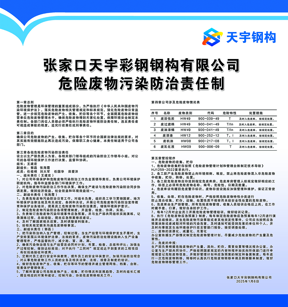 張家口天宇彩鋼鋼構(gòu)有限公司危險(xiǎn)廢物污染防治責(zé)任制